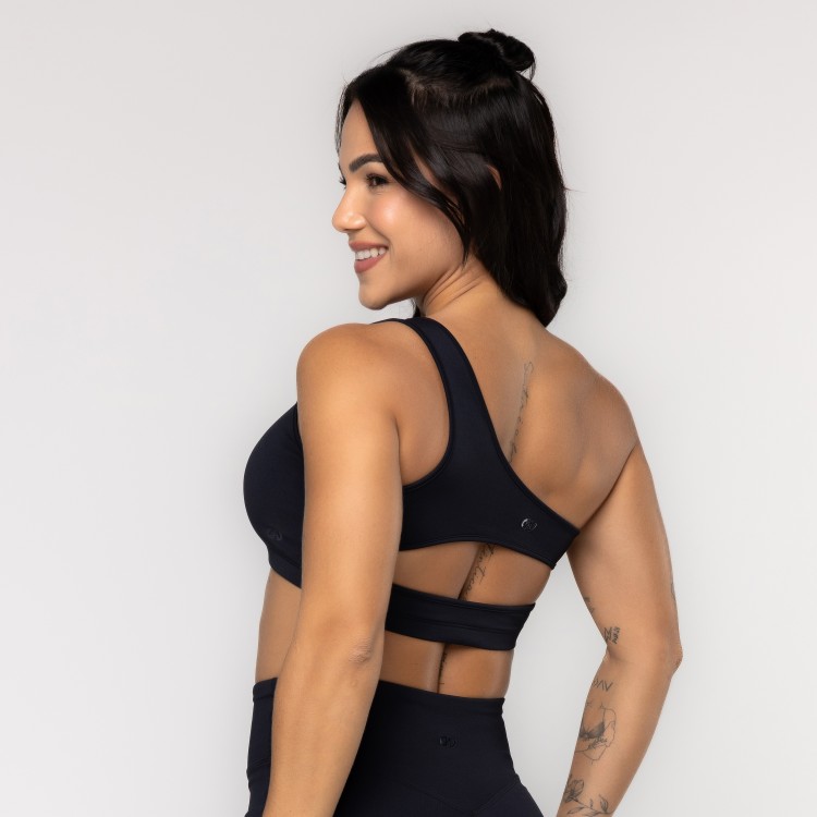 Top Prism em poliamida com elastano, ideal para treinos e atividades físicas. Possui modelagem assimétrica com recorte vazado, proporcionando desing moderno e diferenciado. Barra com acabamento em elástico embutido, garantindo firmeza sem apertar.